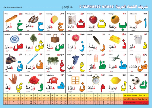 Le poster présenté au début du livre permet à l'enfant d'avoir une vue d'ensemble des 28 lettres arabes et de leurs écritures respectives.