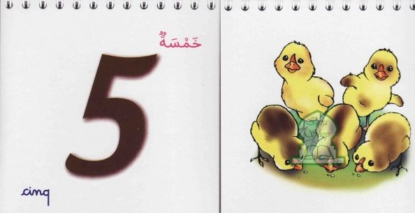 Imagier bilingue arabe - français à spirales découpé en cartes. Comptes les animaux et trouve le chiffre qui correspond.