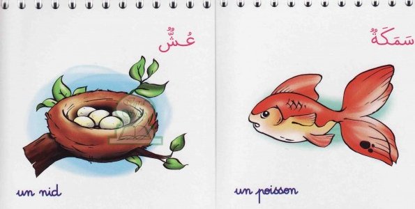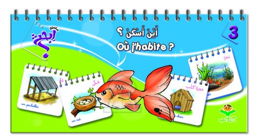 Imagier bilingue arabe - français à spirales découpé en cartes. Trouve où habite le chat, le mouton. Découvre ainsi l'habitat pour 10 animaux.