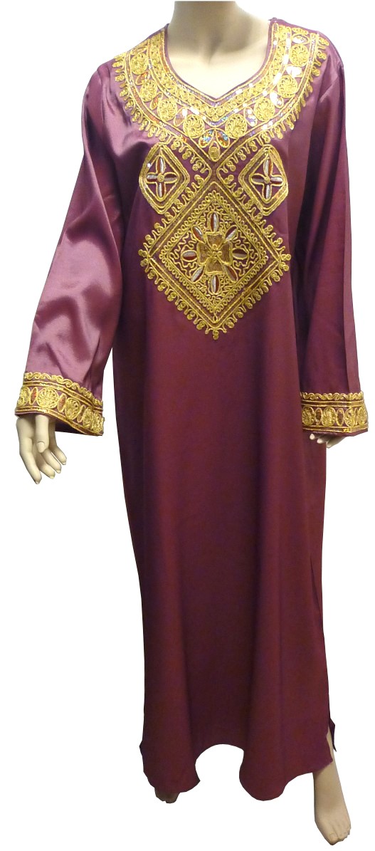 Robe de soirée couleur grenat avec broderies dorées sur le devant et les manches. Tissu épais et satiné.