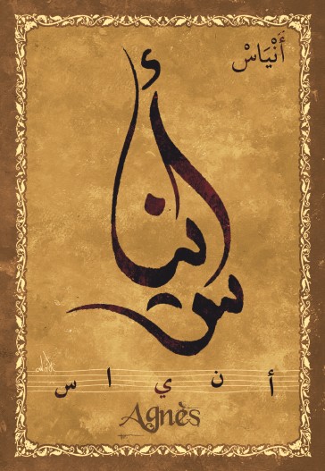 Jolie carte postale représentant le prénom français Agnès calligraphié en arabe ainsi que son épellation lettre par lettre en arabe. Derrière la carte postale se trouve la signification du prénom.