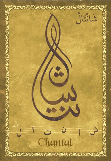 Jolie carte postale représentant le prénom français Chantal calligraphié en arabe ainsi que son épellation lettre par lettre en arabe. Derrière la carte postale se trouve la signification du prénom. Prénom d'origine Occitan signifiant lieux élevés.