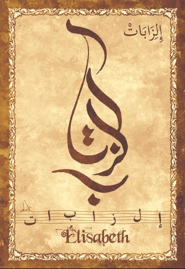 Jolie carte postale représentant le prénom français Elisabeth calligraphié en arabe ainsi que son épellation lettre par lettre en arabe. Derrière la carte postale se trouve la signification du prénom. Prénom d'origine hébreu signifiant Dieu est plénitude.