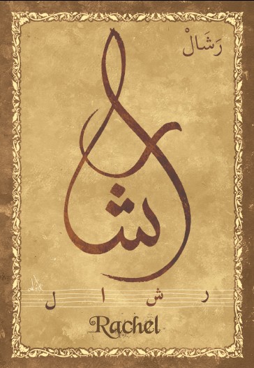 Jolie carte postale représentant le prénom français Rachel calligraphié en arabe ainsi que son épellation lettre par lettre en arabe. Derrière la carte postale se trouve la signification du prénom.