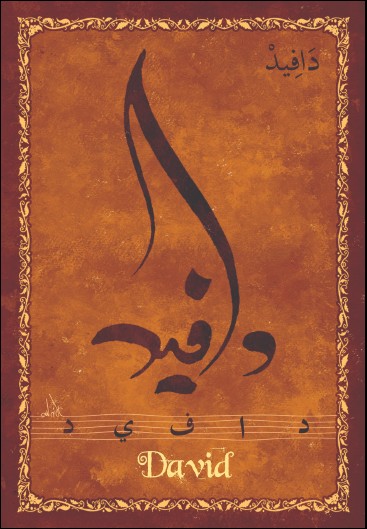 Jolie carte postale représentant le prénom français David calligraphié en arabe ainsi que son épellation lettre par lettre en arabe. Derrière la carte postale se trouve la signification du prénom. Prénom d'origine hébreu signifiant arabe.