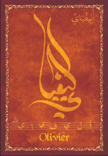 Jolie carte postale représentant le prénom français Olivier calligraphié en arabe ainsi que son épellation lettre par lettre en arabe. Derrière la carte postale se trouve la signification du prénom. Prénom d'origine latin signifiant l'olivier. Prénom d'origine latin signifiant l'olivier.
