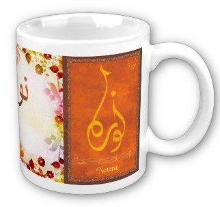 Mug avec le prénom Noura calligraphié en arabe (نورة) ainsi que son épellation lettre par lettre en arabe.