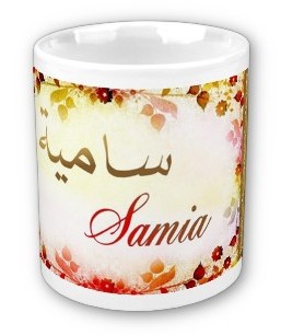 Mug avec le prénom Samia calligraphié en arabe (سامية) ainsi que son épellation lettre par lettre en arabe.