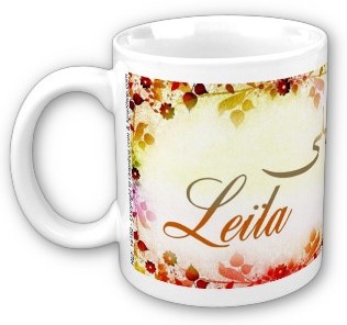 Mug avec le prénom Leïla calligraphié en arabe (ليلى) ainsi que son épellation lettre par lettre en arabe.
