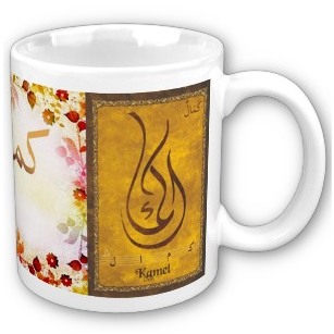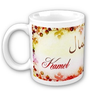 Mug avec le prénom "Kamel" calligraphié en arabe (كمال) ainsi que son épellation lettre par lettre en arabe.
