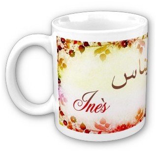 Mug avec le prénom "Inès" calligraphié en arabe (ايناس) ainsi que son épellation lettre par lettre en arabe.