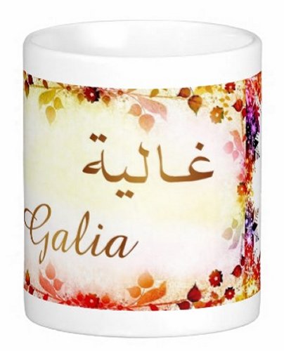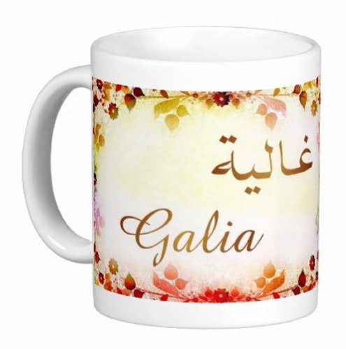 Mug avec le prénom "Galia" écrit en français, en arabe (غالية) et calligraphié de façon artistique en arabe sur la partie droite.
