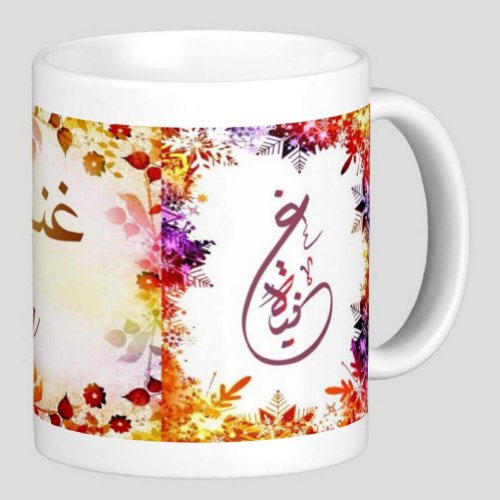 Mug avec le prénom "Ghania" écrit en français, en arabe (غنية) et calligraphié de façon artistique en arabe sur la partie droite.