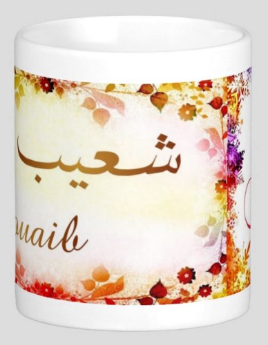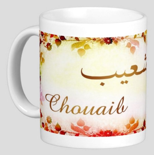Mug avec le prénom "Chouaib" écrit en français, en arabe (شعيب) et calligraphié de façon artistique en arabe sur la partie droite.