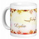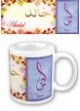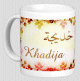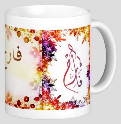 Mug avec le prénom "Farih" écrit en français, en arabe (فارح) et calligraphié de façon artistique en arabe sur la partie droite.