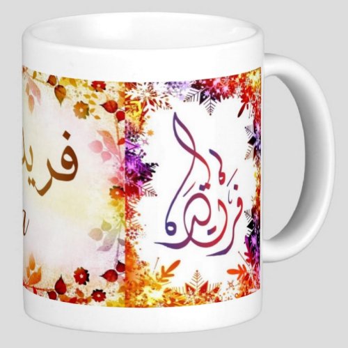 Mug avec le prénom "Farida" écrit en français, en arabe (فريدة) et calligraphié de façon artistique en arabe sur la partie droite.