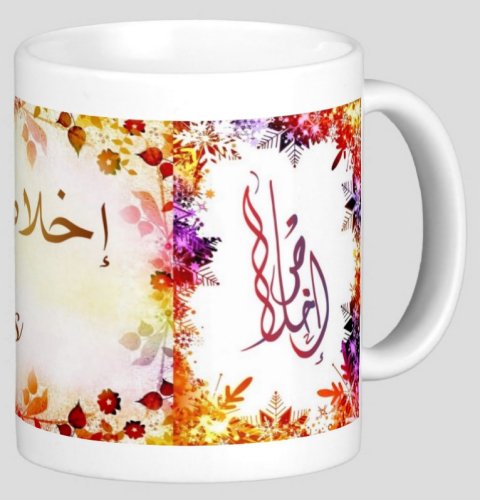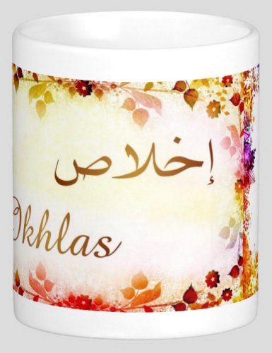Mug avec le prénom "Ikhlas" écrit en français, en arabe (إخلاص) et calligraphié de façon artistique en arabe sur la partie droite.