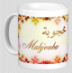 Mug avec le prénom "Ghania" écrit en français, en arabe (غنية) et calligraphié de façon artistique en arabe sur la partie droite.
