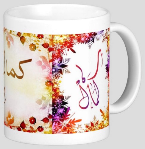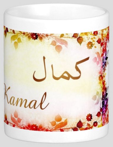 Mug avec le prénom "Kamal" écrit en français, en arabe (كمال) et calligraphié de façon artistique en arabe sur la partie droite.