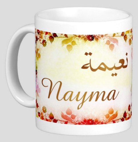 Mug avec le prénom "Nayma" écrit en français, en arabe (نعيمة) et calligraphié de façon artistique en arabe sur la partie droite.