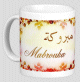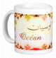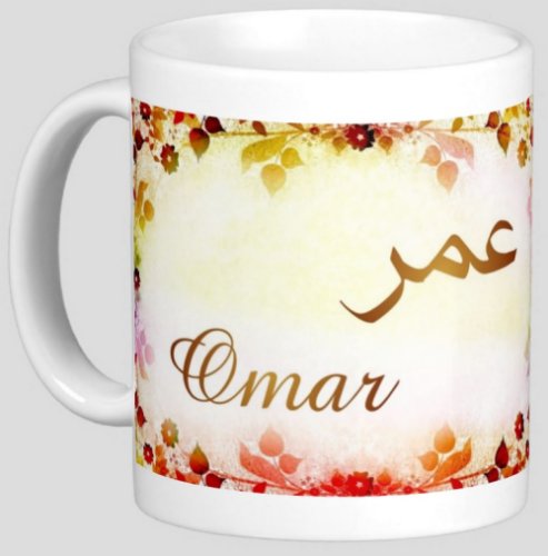 Mug avec le prénom "Omar" écrit en français, en arabe (عمر) et calligraphié de façon artistique en arabe sur la partie droite.