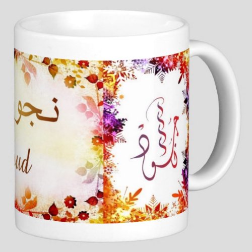 Mug avec le prénom "Noujoud" écrit en français, en arabe (نجود) et calligraphié de façon artistique en arabe sur la partie droite.
