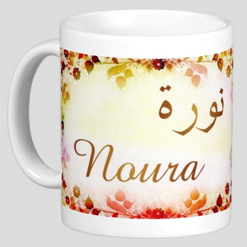 Mug avec le prénom "Noura" écrit en français, en arabe (نورة) et calligraphié de façon artistique en arabe sur la partie droite.