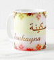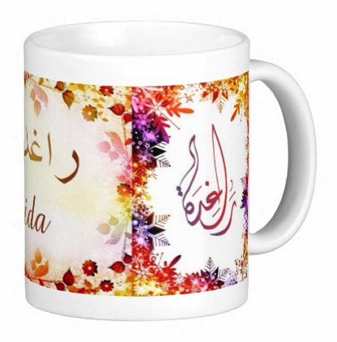 Mug avec le prénom "Raghida" écrit en français, en arabe (راغدة) et calligraphié de façon artistique en arabe sur la partie droite.