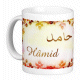 Mug avec le prénom "Wifak" écrit en français, en arabe (وفاق) et calligraphié de façon artistique en arabe sur la partie droite.