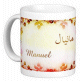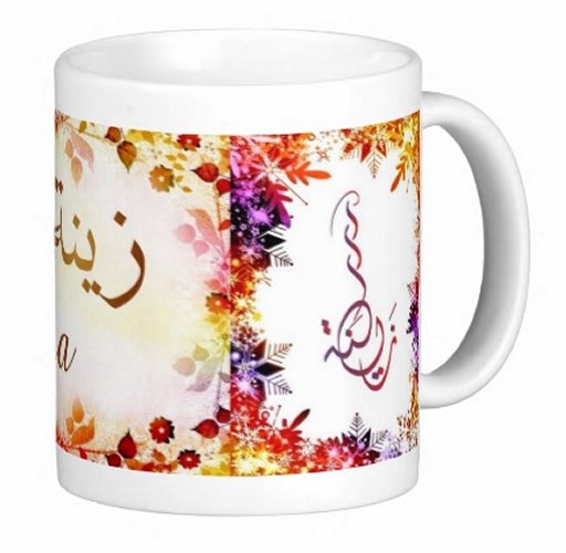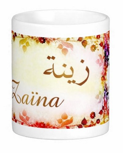 Mug avec le prénom "Zaïna" écrit en français, en arabe (زينة) et calligraphié de façon artistique en arabe sur la partie droite.