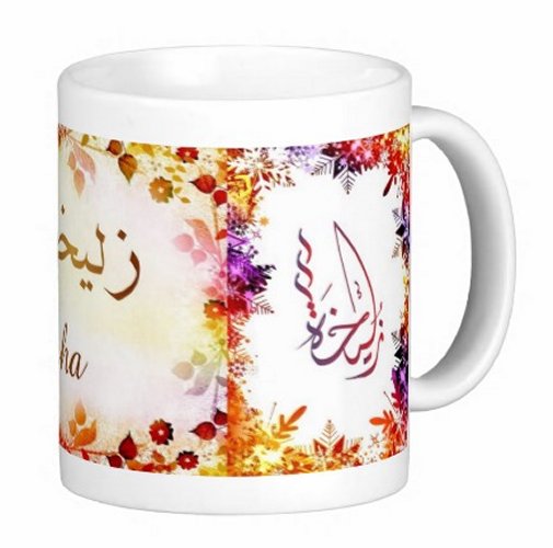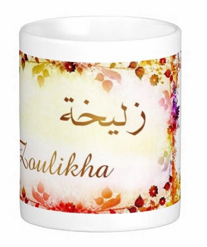Mug avec le prénom "Zoulikha" écrit en français, en arabe (زليخة) et calligraphié de façon artistique en arabe sur la partie droite.