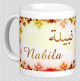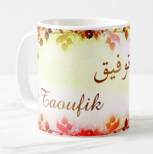 Mug avec le prénom "Taoufik" écrit en français, en arabe (توفيق) et calligraphié de façon artistique en arabe sur la partie droite.