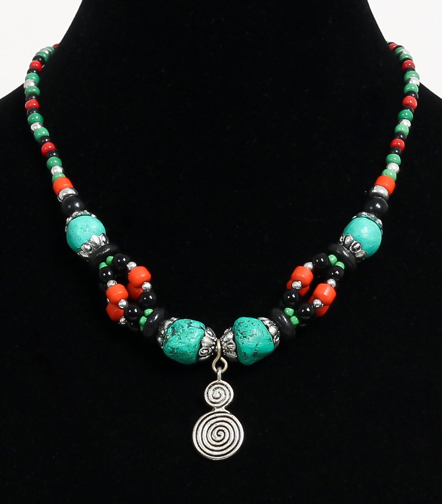Collier ethnique artisanal imitation pierres turquoises agencees de perles multicouleurs et agremente de breloque spirale tourbillon en metal argente