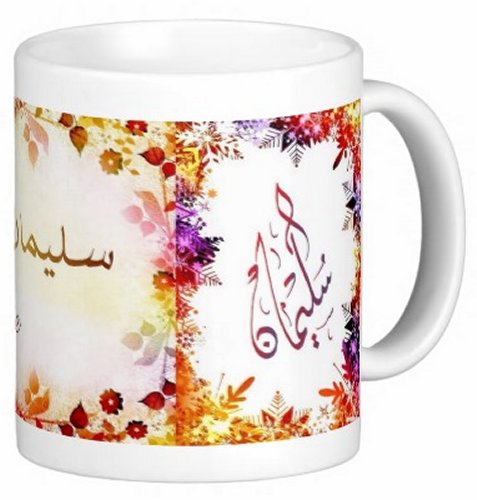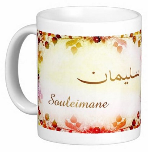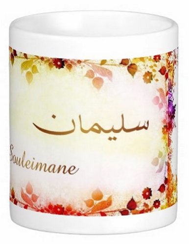 Mug avec le prénom "Souleimane" écrit en français, en arabe (سليمان) et calligraphié de façon artistique en arabe sur la partie droite.