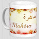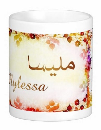 Mug avec le prénom "Melyssa" écrit en français, en arabe (مليسا) et calligraphié de façon artistique en arabe sur la partie droite.