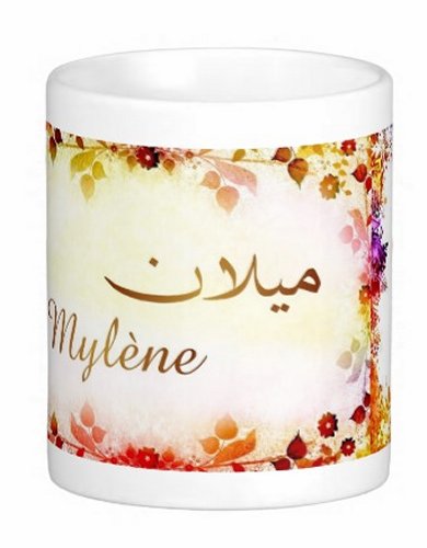 Mug avec le prénom "Mylène" écrit en français, en arabe (ميلان) et calligraphié de façon artistique en arabe sur la partie droite.