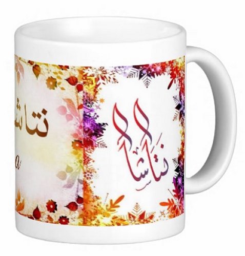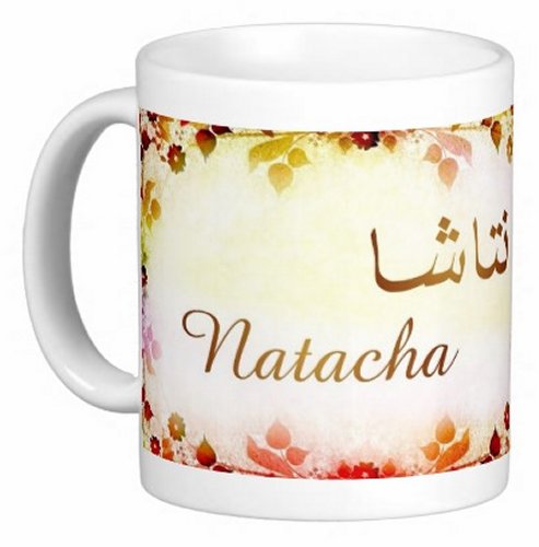 Mug avec le prénom "Natacha" écrit en français, en arabe (نتاشا) et calligraphié de façon artistique en arabe sur la partie droite.