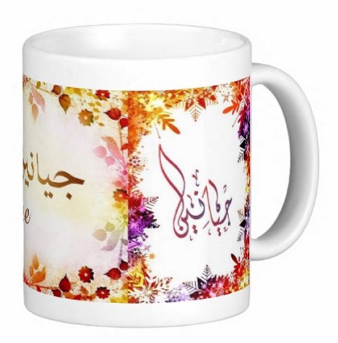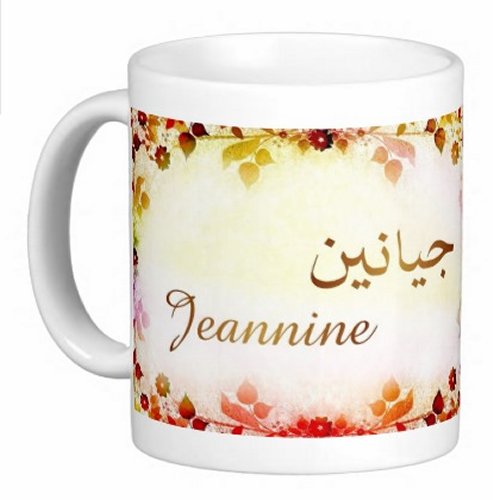 Mug avec le prénom "Jeannine" écrit en français, en arabe (جيانين) et calligraphié de façon artistique en arabe sur la partie droite.
