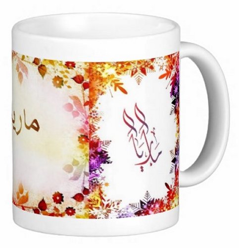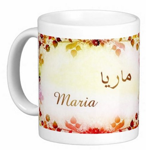 Mug avec le prénom "Maria" écrit en français, en arabe (ماريا) et calligraphié de façon artistique en arabe sur la partie droite.