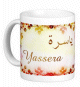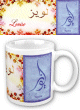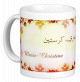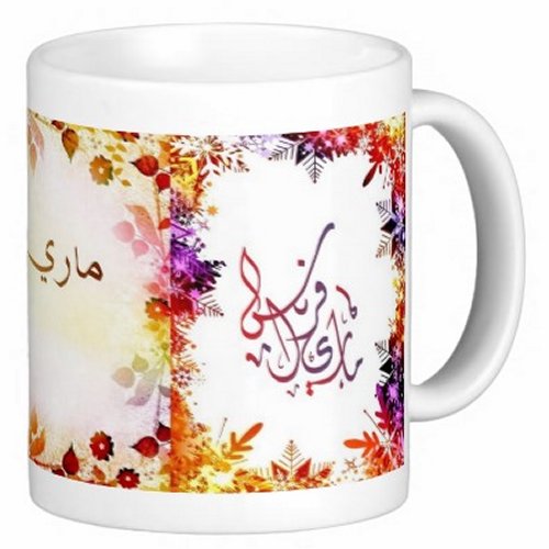 Mug avec le prénom "Marie-France" écrit en français, en arabe (ماري فرانس) et calligraphié de façon artistique en arabe sur la partie droite.