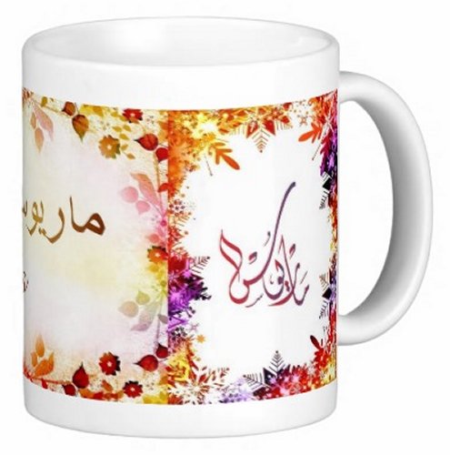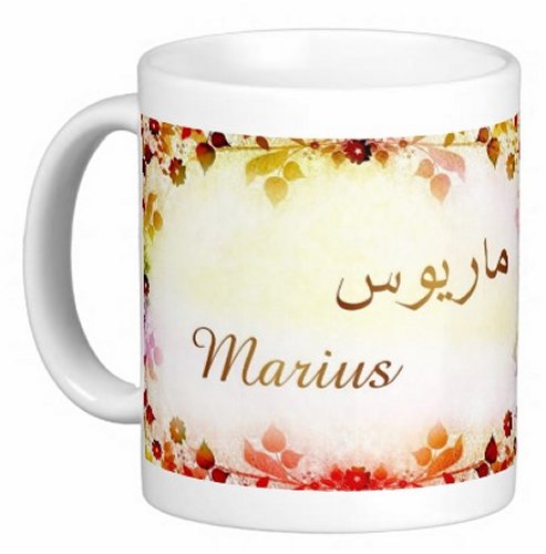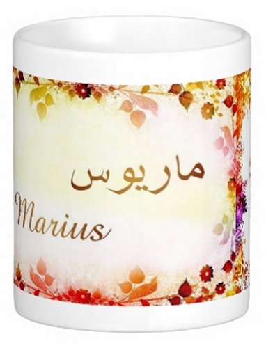 Mug avec le prénom "Marius" écrit en français, en arabe (ماريوس) et calligraphié de façon artistique en arabe sur la partie droite.