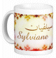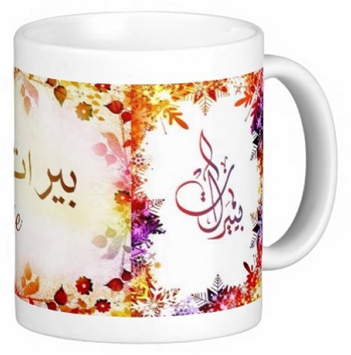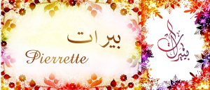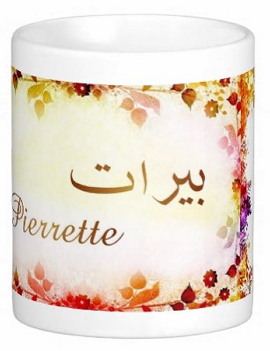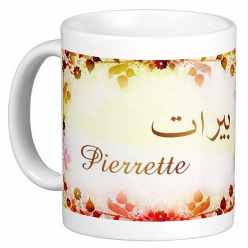 Mug avec le prénom "Pierrette" écrit en français, en arabe (بييرات) et calligraphié de façon artistique en arabe sur la partie droite.