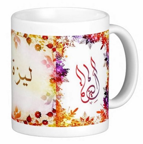 Mug avec le prénom "Lisa" écrit en français, en arabe (ليزة) et calligraphié de façon artistique en arabe sur la partie droite.
