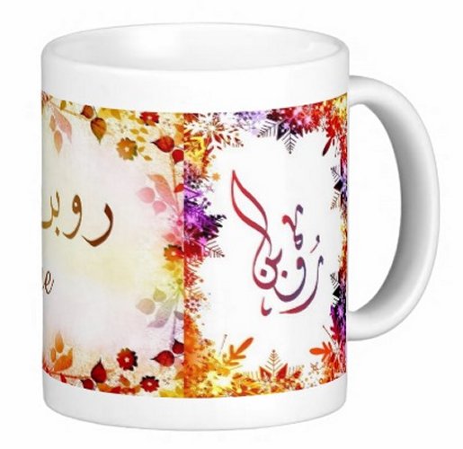 Mug avec le prénom "Robine" écrit en français, en arabe (روبن) et calligraphié de façon artistique en arabe sur la partie droite.