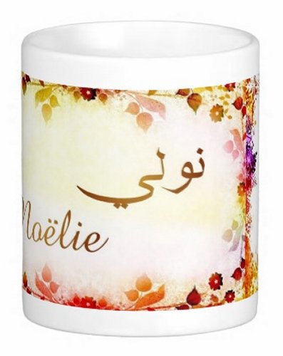 Mug avec le prénom "Noëlie" écrit en français, en arabe (نولي) et calligraphié de façon artistique en arabe sur la partie droite.
