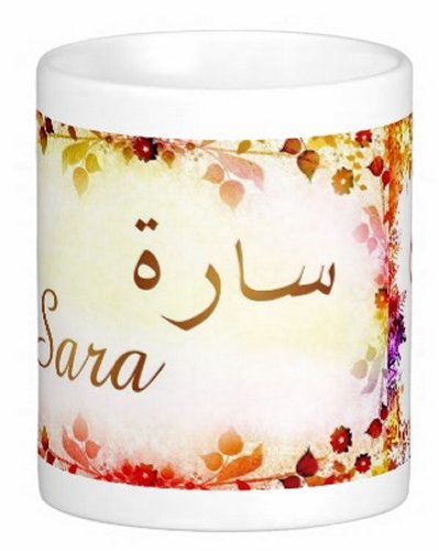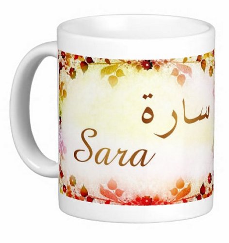 Mug avec le prénom "Sara" écrit en français, en arabe (سارة) et calligraphié de façon artistique en arabe sur la partie droite.
