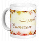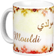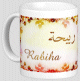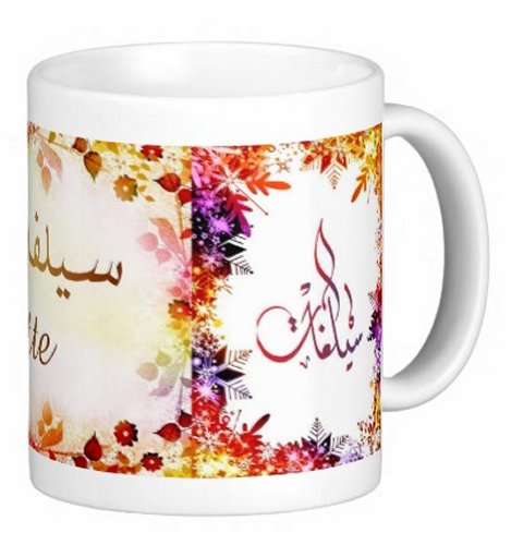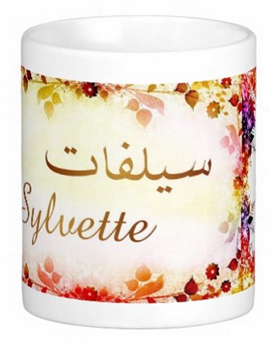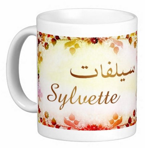 Mug avec le prénom "Sylvette" écrit en français, en arabe (سيلفات) et calligraphié de façon artistique en arabe sur la partie droite.