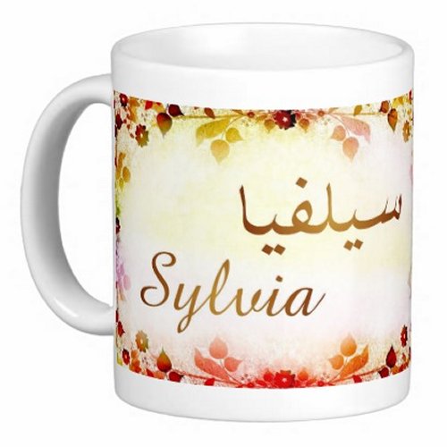 Mug avec le prénom "Sylvia" écrit en français, en arabe (سيلفيا) et calligraphié de façon artistique en arabe sur la partie droite.