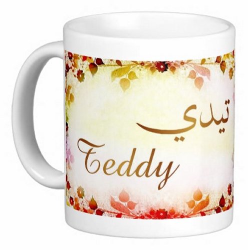 Mug avec le prénom "Teddy" écrit en français, en arabe (تيدي) et calligraphié de façon artistique en arabe sur la partie droite.
