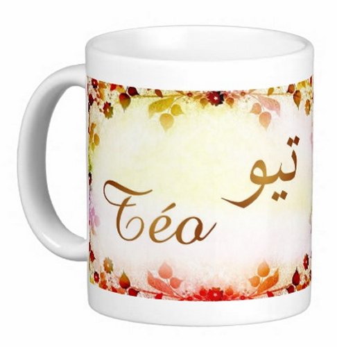 Mug avec le prénom "Téo" écrit en français, en arabe (تيو) et calligraphié de façon artistique en arabe sur la partie droite.